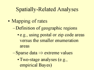 | An example of these types of studies were presented in Part 1 of the landfill site. A key issue was how to define relatively homogeneous exposure areas. In the absence of “hard” exposure data, there is a trade-off between bias and precision; small areas may be more homogenous in terms of exposure but small sample sizes will lead to less precision. |