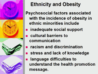 Obesity is more common in South Asians men, and women, from all minority ethnic groups. South Asians are less likely to participate in physical activity with the lowest levels found in the Bangladeshi community, as well as amongst the minority ethnic groups; Chinese have the highest levels of consumption of fresh fruit and Pakistani adults the lowest. |