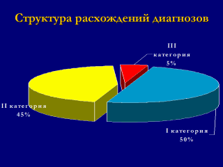 II категория – 45% в среднем по РФ и до 75% на Урале (ошибка по субъективным причинам, не сыгравшая ведущую роль в танатогенезе). III категория – 5% в среднем по РФ и 11% на Урале (ошибка по субъективным причинам, повлекшая за собой смертельный исход). |