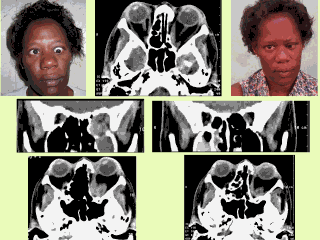 | The right pictures show postoperative results of orbital decompression by nasal endoscopy. In the axial and coronal cut, you can note the displacement of right medius rectus muscle toward the etmoidal sinus. Thus, the compression is eliminated in the optic nerve. The VA of OS was improved from 0.05 to 0.6 |