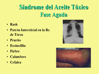 Básicamente, la fase aguda se caracterizó por una enfermedad pulmonar grave con patrón intersticio-alveolar en la radiografía de tórax. Algunos días después estos pacientes, desarrollaban cifras altas de eosinofilia. La mayoría de los pacientes presentaron otros síntomas generales acompañando a este cuadro. Durante esta fase muchos de los enfermos fallecieron debido a insuficiencia respiratoria aguda por un edema pulmonar de origen no cardiogénico Kilbourne EM, Rigau Perez JG, Heath CWJ, et al. Clinical epidemiology of toxic-oil syndrome. Manifestations of a New Illness. N Engl J Med 1983;309(23):1408-14. Toxic Epidemic Syndrome Study Group. Toxic epidemic syndrome, Spain, 1981.. Lancet 1982;2(8300):697-702. |