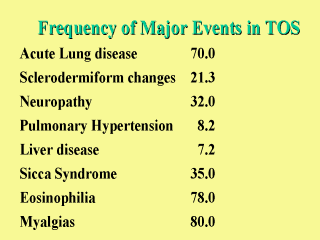 Syndrome and Graft versus Host diseases. These similarities have led to many investigators to presuppose common origins and pathogenesis. Philen RM, Posada de la Paz M. Toxic oil syndrome and eosinophilia-myalgia syndrome: May 8-10, 1991, World Health Organization meeting report. Semin Arthritis Rheum 1993;23(2):104-24. Kilbourne EM, Posada de la Paz M, Abaitua Borda I, et al. Toxic oil syndrome: a current clinical and epidemiologic summary, including comparisons with the eosinophilia-myalgia syndrome. J Am Coll Cardiol 1991;18(3):711-7. Philen RM, Hill RH. 3-(Phenylamino)alanine--a link between eosinophilia-myalgia syndrome and toxic oil syndrome? [editorial; comment] . Mayo Clin Proc 1993;68(2):197-200. |