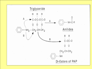 information on them was added for the development of other projects. Vazquez Roncero A, Maestro Duran R, Ruiz Gutierrez V. New aniline derivatives in Toxic Oil Syndrome . Toxicity in mice of 3-phenylamino-1,3-propanediol and its fatty acid mono- and diesters. Grasas aceites 1984;35(5):330-1. Schurz HH, Hill RH, Posada de la Paz M, et al. Products of aniline and triglycerides in oil samples associated with the toxic oil syndrome. Chem Res Toxicol 1996;9(6):1001-6. Schurz HH, Hill RH, Philen RM, et al. Analytical measurements of products of aniline and triglycerides in oil samples associated with the toxic oil syndrome. Arch Toxicol Suppl 1997;19:53-64. |