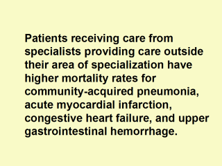 | Source: Weingarten SR, Lloyd L, Chiou CF, Braunstein GD. Do subspecialists working outside of their specialty provide less efficient and lower-quality care to hospitalized patients than do primary care physicians? Arch Intern Med 2002; 162(5):527-532. |