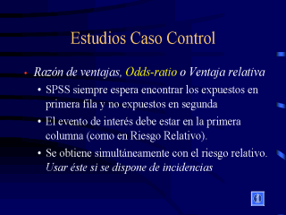 En el caso de esudios retrospectivos hacemos un cociente de odds o razón de apuestas entre los afectados y los no afectados. Podemos decir que el índice o apuesta de los afectos es de 3/1 respecto del factor de interés, mientras que en los no afectos es de 3/2. El cociente de razones es por tanto de (3/1)/(3/2) = 2