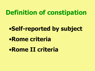 1. Do you strain during a bowel movement? Functional constipation (Rome criteria). Two or more of 4 criteria: questions 1, 2 and 3 (answer= often or always) and fewer than three bowel movements a week; or fewer than two bowel movements a week as sole criterium. Functional constipation (Rome II criteria). Two or more of 6 criteria: questions 1, 2, 3, 4 and 5 (answer= often or always) and fewer than three bowel movements a week. Absence of loose or watery stools. |