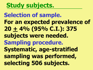 For an expected prevalence of chronic constipation of 20 percent, a sample size of 375 subjects was estimated to provide a 95 percent confidence interval (95%-CI) of +/- 4 percentage points. With an expected response of 75 percent, the global sample required totaled 500 subjects. Systematic, age-stratified sampling was carried out, arbitrarily considering three groups: 18-30 years, 31-50 years and 51-65 years. |