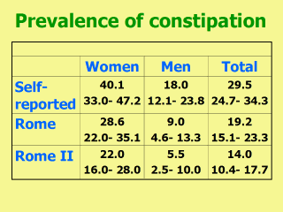 The prevalence of constipation was significantly greater among women according to all criteria.