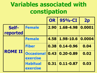 Female gender was a risk factor for constipation. Intake of a medium quantity of fiber and exercise were protective factors for constipation.