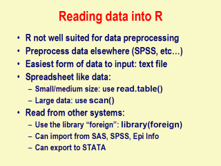 like: library(foreign) mydata <- data.frame(read.spss("myfile.sav",use.value.labels=TRUE)) Here, you call the library "foreign" so that you can read data that is stored in a foreign format. Then store that data in the object called "mydata". You have to remember that you need to give full path of the file that is read in. In this example, the data file was in the same folder as the working directory of R. Once you have obtained a data frame, you can export it to different file formats. We prefer exporting it to a comma separated or tab delimited file for ease of use. Use the function "write.table" to accomplish the task. See ?write.table in an R session for more information. |