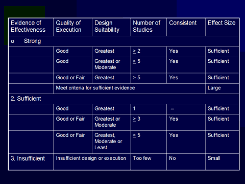 The important point about this algorithm is that there are many different pathways to drawing conclusions about a body of evidence. For example, sufficient evidence can reflect either a relatively small number of very well designed and executed studies or a larger number of studies with lesser suitability of design or more limited quality of execution. Recommendations of the Task Force usually emerge directly from the strength of the evidence. For example, a strong body of evidence of effectiveness leads to a strong recommendation for the intervention. Likewise, evidence that the intervention is ineffective would lead to a recommendation against using that intervention. There are exceptions to these rules which I will discuss momentarily. To date, more than 70 recommendations have been made in diverse public health areas, and the resulting conclusions seem to have generally had good face validity. |