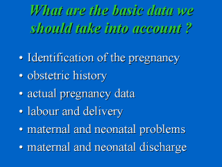 city, literacy, marital status). Obstertric history: (pregnancies, abortions, deliveries, live born, death born, cesarean delivery, previous newborns <2.500 grs, previous twins, last pregnant date). Pregnancy data:usual weight, height, last menstrual period date, doubts on that, tetanous toxoid vaccination date, Rh factor, smoking, number of prenatal visits; date, gestational age and weight at first and last prenatal visits. Labour and delivery: day of admittance, gestational age, presentation, fetal size, onset labour, integral membranes, method of delivery (spontaneous, forceps, cesarean), date of delivery, cause of cesarean delivery. Mother: pathology of the mother during pregnancy. Newborn: infant record, sex, weight, lenght, head circumference, gestational age by physical exam, weight for gestational age, apgar at 1th and 5th minutes , resucitation, physical exam, neonatal problems, rooming in, date, food and weight at discharge. |