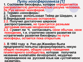 5. В основе теории ноосферогенеза лежат новые принципы нравственности, новая система нравов, которая должна быть универсальной для всей планеты, при всем различии цивилизаций населяющих ее народов.6. Ч. должно опереться на свой коллективный разум и найти пути создания общества, способного к совместному развитию с биосферой, т.е. сможет перейти в эпоху ноосферы.[1] Моисеев Н.Н. Пути ноосферогенеза//"Э к о л о г и я и ж и з н ь" (2-3, 1997). |