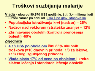 Kontrola malarije je veliki javnozdravstveni problem u kineskoj provinciji Henan. Ovaj slajd pokazuje da je koštanje bolesti po osobi čak sto puta veće od koštanja prevencije. http://www.pitt.edu/~super1/lecture/lec5501/008.htm Professor Xi-Li Liu, TDR/WHO Project Principal Investigator Henan Provincial Institute of Parasitic Diseases, China