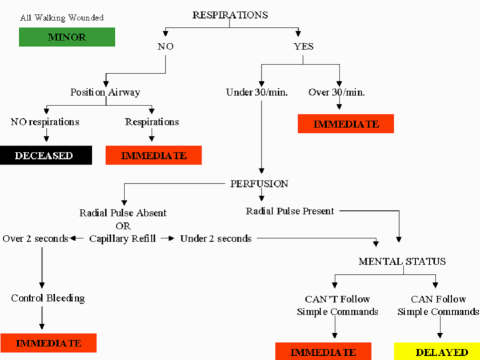 | Triage scheme as recommended by the Simple Triage and Rapid Treatment protocol. Note how the first element of this algorithm is to categorize all walking wounded as green. From a practical stand point a triage office will state "All walking wounded or anyone that can walk go this way". |