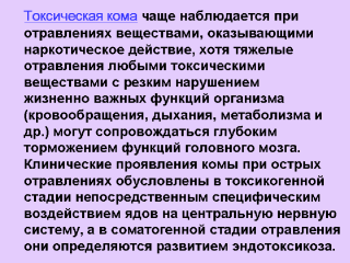 Для каждого вида токсической комы, вызванной действием определенной группы токсических веществ характерна своя неврологическая симптоматика, наиболее отчетливо проявляющаяся на стадии поверхностной комы. Наряду с наркотической токсической комой, с неврологической симптоматикой поверхностного или глубокого наркоза (мышечная гипотония, гипорефлексия), наблюдаются коматозные состояния с выраженной гиперрефлексией, гиперкинезами, судорожным синдромом. |