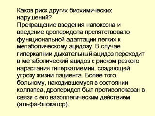 1. Корригировать гиперкалиемию. Обусловленную рабдомиолизом гиперкалиемию наиболее быстро можно устранить ощелачиванием (250 мл молярного или полумолярного раствора бикарбоната). 2. Корригировать артериальное давление и увеличить диурез. Нормализация артериального давления достигается массивной инфузионной терапией. После быстрого введения 1 л макромолекулярных плазмозамещающих растворов вводили плазму крови до восстановления диуреза (1-2 л). Инфузионная терапия проводится под контролем центрального венозного давления. Не рекомендуется использование катехоламинов, в связи с их возможным аритмогенным действием на миокард. 3. Ограничению зоны рабдомиолиза способствует адекватная анальгезия, которая позволяет разрешить мышечные контрактуры. Кроме того, искусственная вентиляция легких уменьшает риск гиповентиляции и гипоксии тканей. Это наблюдение иллюстрирует непростое переплетение психического возбуждения и органической патологии, показывает многообразность этих проявлений у токсикоманов. Лишь строгая методология клинического и лабораторного исследований, тщательный анализ полученных данных позволили благополучно разрешить создавшуюся ситуацию. |