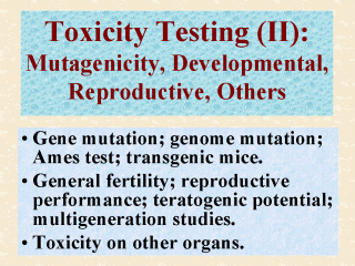 their genome. Tests on general fertility and reproductive performance are usually performed in rats. The teratogenic potential for chemicals is determined in rabbits, rats, or mice, with doses typically administered during the first trimester which is usually the most vulnerable stage for organogenesis. The perinatal and postnatal toxicities also are examined. In addition, a multigeneration study is often conducted in rats mating over two or three generations to determine the effects on the reproduction system. Tests for toxic responses of other organs (nervous system, kidney, lung, liver, blood, skin, heart, eye, etc.) in general require the conduct of acute, subchronic, and chronic studies which are discussed in the next slide. |