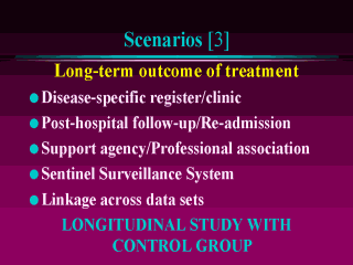 treatment. Where do you find the patients and how do you document the outcomes? The obvious thing would be to identify diagnosed patients from a disease register (if they exist) and subsequently contact patients with the doctors consent. Alternatively, go to a specialist clinic and interview patients there after you obtain ethics approval. You could also find out about patients who have been discharged and later contact them to follow-up on your topic and/or examine their records on re-admission. However, this is often not possible unless you have the cooperation of hospital staff and patient consent. Some cities have an established support group (e.g. Multiple Sclerosis Society) of a professional body (Diabetes Health Professionals) directly treating the patient and having access to their clinical records. These two sources could also be investigated. Less comprehensive databases but containing information not available in hospitals are doctors based sentinel systems. Again, these will cover a range of less severe cases who may well have very different long-term outcomes. If all human contact fails and you obtain ethics approval, you can consider linking hospital or doctors data with hospital admissions, or mortality, cancer or other disease registers (postulated to be long-term outcomes of the treatment under study). IN A PERFECT WORLD OF ENDLESS MONEY AND UNEXPOSED PATIENTS, A LONGITUDINAL STUDY WITH A CONTROL GROUP WOULD BE THE BEST OPTION. |