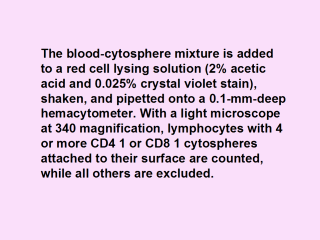 (CD14) are 0.56 mm in diameter and therefore can be differentiated from the CD4 1 beads which are 1.0 mm in diameter. The total count is achieved by adding up all lymphocytes that meet this criterion and multiplying the sum of both chambers by 7.3 for CD4 1 and 6.2 for CD8 1 lymphocytes. Samples were run in triplicate for both T-lymphocyte populations, and the means of the three trials were multiplied by the proper conversion factors, as determined by the manufacturer, in order to obtain the absolute counts. |