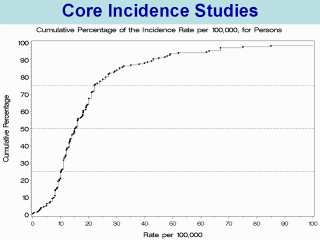 | Based on discrete core data for persons (55 studies and 170 rates), the distribution of rates was asymmetric and had a median value (10%–90% quantile) of 15.2 (7.7–43.0) per 100,000. |