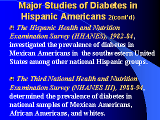 For the Third National Health and Nutrition Examination Survey (NHANES III, 1988-94) population of the same age group, however, the percentages are 2.9 and 3.8 among the males and females, respectively. The HHANES data comprises different portions of the Hispanic American and Mexican-American population residing in several Southwestern states. Thus far, the studies reviewed suggest that prevalence of diabetes is greater in Mexican-American females than in their male counterpart, greater in Hispanic Americans than in Non-Hispanic Whites, and that Hispanics usually tend to be heavier than their Non-Hispanic White Counterpart.