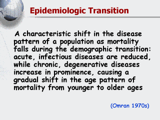 mortality from younger to older ages. In general, Epidemiologic transitions (in general), Any major shift in patterns of disease or