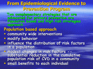 are the “population approach” and “high-risk approach. population approach:community wide interventions seek to modify behaviors and thereby influence the distribution of risk factors in the population. Even modest changes in risk factors are expected to contribute to a substantial reduction in the cumulative population risk of CVD because of the large number of people affected. |
