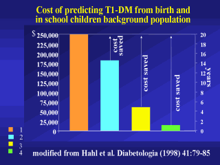 cost for T1-DM care per 20 years 2 - estimated cost to identify from birth 1 children developing T1-DM in 10 years by strategy 1 (cumulative risk= 0.4%) 3 - estimated cost to identify from birth 1 children developing T1-DM in 10 years by strategy 2 (cumulative risk= 0.4%) 4 - estimated cost to identify 1 school children developing T1-DM in 5 years (cumulative risk= 0.32%, PPV = 35%) |