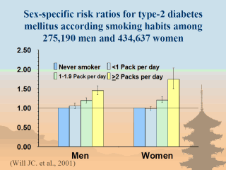 | The Cancer Prevention Study I, a study of the largest number of subjects followed, reported a significant dose-response relation between smoking and risk of diabetes mellitus among middle-aged men and women. |