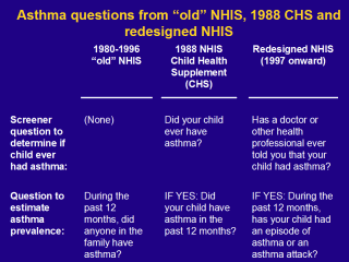 questions from the various NHIS survey years are shown here. The first column shows the asthma question before the 1997 redesign. There was a single question asking if anyone in the family had asthma in the past 12 months, and the estimates produced by responses to this question were called "asthma period prevalence." The last column shows the questions implemented in 1997. There is a screener to determine if a doctor or other health professional had ever diagnosed the sample child with asthma. If yes, then the parent is asked if the child had an asthma attack in the past 12 months. To be included as a "case" after 1997, a respondent must report that he or she has been diagnosed with asthma by a health professional and had at least one attack or episode of asthma in the past 12 months. Since this case definition is more specific, it is not surprising that asthma attack prevalence estimates are lower than pre-1997 asthma period prevalence estimates. But how much of the decrease is due to the change in the question versus an actual change in underlying asthma prevalence in the population? The middle column shows questions from the 1988 CHS. Half of the child sample from the standard 1988 NHIS was also asked the questions in the CHS. Therefore, there is a sample asked both the question in the first column, and the two part question in the second column that are similar, but not identical, to those in the redesigned NHIS. The difference between prevalence estimates produced by the first column and the second column can be used to measure how changing the questions in 1997 affected asthma prevalence estimates. However, this comparison will only yield a rough approximation because the 1988 CHS did not ask about receiving a diagnosis of asthma from a health professional. |