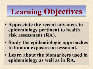 since such is derived from observational studies. Epidemiology involves the association of diseases to risk factors and human exposures. Accordingly, here the students are also expected to learn some of the recent developments in human exposure assessment, specifically those pertinent to the recent advances in epidemiology or RA. One recent advance in epidemiology especially noteworthy is the use of biomarkers, which are physiological, biochemical, or molecular alterations measurable in biologic media such as human cells, fluids, or tissues (Hulka, 1990). The use of biomarkers in epidemiologic studies has now become a popular assessment tool. In the last part of this lecture, students will learn how and why biomarkers can be used to extend our understanding of the steps between exposure and disease occurrence, and about the limitations of this use. |