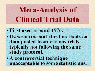 clinical trails considered by the analyst to be combinable.” In a meta-analysis, different statistical methods may be used to combine the data. However, a typical procedure will use a weighted average of the results, with the larger trials having more influence over the smaller ones. The more complicated problems with the use of this type of analysis are, however, the parts that deal with identifying the relevant studies and with expressing the individual results in a standardized format. Despite its widespread use, meta-analysis continues to be a controversial technique unacceptable to some statisticians. This is because the pooling of results from clinical trials that involved independent but varied study protocols is simply statistically unsound. Epidemiologists continue to take advantage of meta-analysis because a single study often cannot detect or exclude with certainty a modest, yet clinically relevant, difference in two treatment effects. |