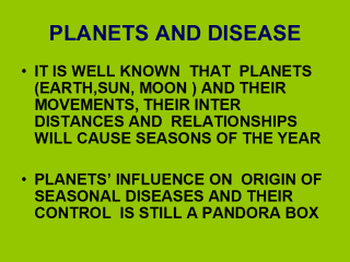 Planetary movements cause seasons of the year. They explain also the seasonal effects on health of the people. If there is no truth in it how can they survive for centuries? This origin of the disease , we have to diligently search. |