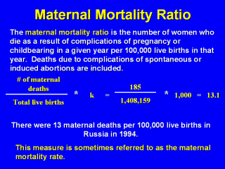 | A valid maternal mortality rate would divide the number of maternal deaths by the population-at-risk; the number of pregnant women in the population. This information is typically unknown and inaccessible. |
