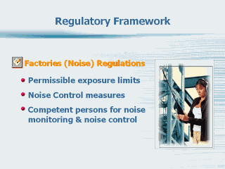 A significant development was the introduction of the Factories (Noise) Regulations4 which came into effect on 1 Jan 1997. The Regulations require factory occupiers and employers to take measures to reduce or control noise so that workers are not exposed to excessive noise. The permissible exposure limits (equivalent level of 85 dBA over an 8-hour workday) and noise control measures are specified in the Regulations. New machinery and equipment with excessive noise are not allowed unless incorporated with noise control measures. Suppliers of noisy machinery and equipment must provide information on the noise level generated by their products and label them. Factories with 10 or more workers exposed to excessive noise must appoint a competent person to conduct regular noise monitoring of at least once every three years. Factories with 50 or more workers exposed to excessive noise must appoint a suitably qualified person to advise the management on noise control measures. Persons appointed for noise control and noise monitoring must attend approved training. The Regulations also require factory occupiers and employers to provide hearing protectors to all persons exposed to excessive noise. They must put up warning signs indicating that hearing protectors must be worn in areas with excessive noise. In addition, they must institute a training programme for persons exposed to excessive noise. 4. The Government of Singapore. The Factories (Noise) Regulations. The Government Printer, 1996. |