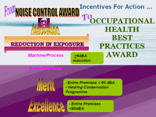 Awards To give further impetus to noise control efforts at the plant level, the Ministry introduced a Noise Control Awards (NCA) scheme in 1999. The awards comprised three categories: Excellence Award: for companies that have made outstanding achievements in noise control at the workplace. To qualify for this award, the noise level in the entire premises must be below 85 dBA, the noise reduction (NR) should be at least 6 dBA per source, and the total NR should be at least 10 dBA. Merit Award: for companies that have made significant achievements in noise control at the workplace. The criteria are similar to that of the Excellence Award except that the noise level in the premises must be below 90 dBA, and there must be an effective hearing conservation programme implemented. Innovation Award: introduced in 2003 to encourage companies to apply creative or innovative ideas, methods or techniques to control noise. Over the years, the biennial awards scheme received increasing support, with a total of 29 companies receiving recognition for their efforts in controlling noise – seven in 1999, 10 in 2001 and 12 in 2003. Following the success of the NCA, the scheme has been incorporated into a wider recognition system - the Occupational Health Best Practices (OHBP) Award The inaugural OHBP Awards presented in October 2004, featured both Noise and Chemical Control categories, and saw 15 companies winning in the Noise Control category. The objective of the new scheme is to encourage companies to address not only noise, but other health hazards as well, and an Ergonomics Solutions category will be included from 2005. |