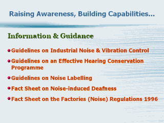 The Ministry collaborates with relevant agencies, employers’ organisations and unions in various training and promotional activities. Information leaflets on hearing protectors and pamphlets on NID are distributed to factories with noise problems. To cater to the multilingual local and migrant workforce, the materials are produced in various languages. Information and Guidance The following guidelines and educational materials are available on the Ministry’s website:Guidelines on Industrial Noise and Vibration Control Guidelines on an Effective Hearing Conservation Programme Guidelines on Noise Labelling Fact Sheets on Noise-induced Deafness and the Factories (Noise) Regulations 1996 |
