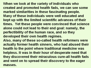 | Their mission, as I have alluded to, was not merely to defeat disease but also to foster total vitality, human perfectibility, not unlike the promises made by the health spas today. |