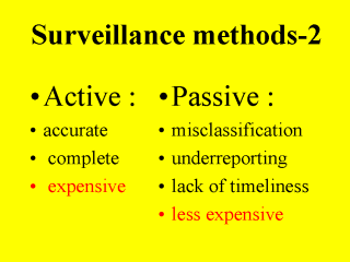 surveillance (P.S). Thus A.S surveillance have the less chance of continuation than P.S , especially in countries with limited resources. Although data of A.S usually are more accurate than P.S. |