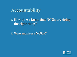 As NGOs, especially international NGOs, tend to be outside of many government controls and official scrutiny, accountability can be issue. |