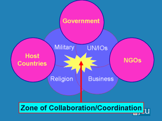 | NGOs must establish a zone of collaboration and co-ordination with all agencies involves with disaster response. It is very important to establish collaboration and co-ordination with local agencies of host nations. |