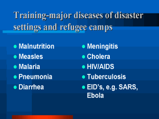 | Training should include developing an understanding of the major diseases that may be present in disaster settings and refugee camps. |