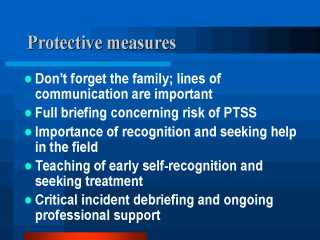 | In addition to measures to reduce the stress of the deployment, such as ensuring reliable means of communication with friends and family, formal measures to recognize PTSS as well as formal briefing and debriefing, where appropriate, may be useful. |