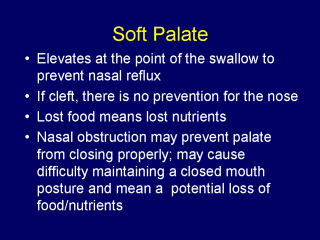 point of the actual swallow. Think about when you have a cold and your nose is “stuffed up.” How do you breathe? Through your mouth. What is like to eat and chew when you are like this? Difficult because you have to breathe through your mouth since you can’t through your nose and it makes it hard to “chew with your mouth closed.” What happens if the soft palate does not close properly? Loss of nutrients and food out of the nose. This is most prevalent in children with a cleft palate. In speech this may also cause a “nasal” quality to the sound of a person’s speech. |