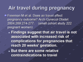 | Does air travel affect pregnancy outcome? A study by Freeman et al (2004) of a small cohort of 222 pregnant women suggest that air travel is not associated with increased risk of complications for pregnancies that reach 20 weeks' gestation. But there are some relative contraindications to travel. |