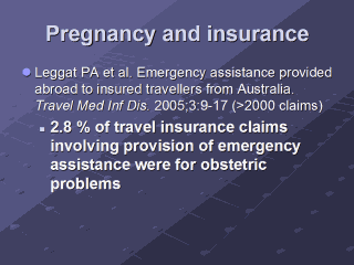 | Leggat et al (2005) found that 2.8 % of travel insurance claims involving provision of emergency assistance were for obstetric problems. |