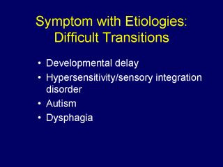 transitions refers to transitions during feeding time. More behavioral symptoms seen with children who have autism or pervasive developmental delay (PDD), also seen with children who have developmental delay. Hypersensitivity: may be characterized by rejection of oral stimulation. Also seen with history of prolonged feeding. |