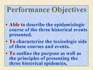 it would shed light on the etiology of the event. In addition, students should contrast the impacts made by the toxicologic information on these epidemiologic events, and be able to conceptualize the difference in these impacts. Insofar as the same type of toxicologic information is not always needed or readily obtainable, the importance and relevance of toxicologic information to an epidemiologic event necessarily varies with the situation involved. Finally, students should be able to appreciate the purpose for which the three case studies were presented in this lecture. There are numerous epidemiologic events in our history. The case studies were purposely selected to represent certain important principles which were summarized in the slides labeled The Lesson (to be learned). |