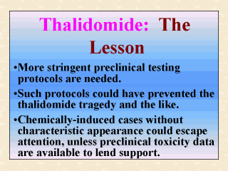these reasons, stringent preclinical testing becomes foremost important. Epidemiologists and clinicians may even accept the argument that, had the teratogenicity of a synthetic drug be tested under a more stringent preclinical protocol in the 1950s, the thalidomide tragedy might not have occurred. It is also important for epidemiologists to realize that the thalidomide epidemic involved over 6,000 malformed babies worldwide (Neubert et al., 1999), all having rather unusual characteristic appearance. Yet there may be incidents of common birth defects induced chemically that otherwise would occur spontaneously at high incidence. In that case, the teratogenicity involved may escape the attention of many epidemiologists or clinicians, unless preclinical toxicity data from animal studies are there available to lend some empirical support. In short, data from well-designed preclinical testing can serve to prevent the onset of a chemically-induced episode. And such is apparently the ultimate public health goal of epidemiology. |